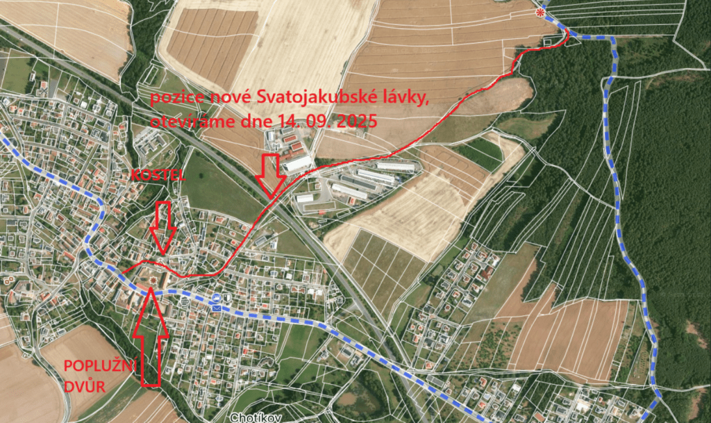 Máme velkou radost, že vás jménem starostky obce v Chotíkově, paní Ing. Evou Hirschfeldovou, můžeme pozvat k slavnostnímu otevření svatojakubské lávky a to v neděli 14. září 2025. Lávka leží na trase železné svatojakubské cesty. V této souvislosti dojde také k přeložení stávajícího modrého turistického značení a tím ke zkrácení a zpříjemnění turistické trasy, která v tomto úseku povede méně po silnici a zastavěnou oblastí.